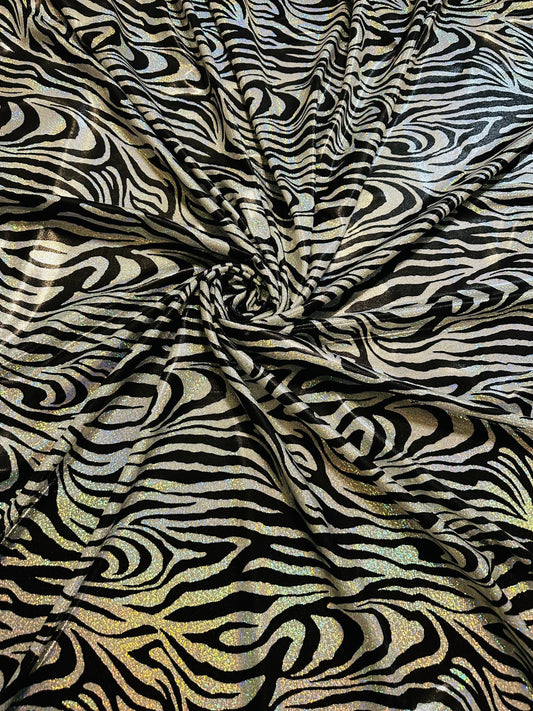 Wild Zebra design hologram metallic nylon spandex with iridescent foggy foil 58/60” 4-way stretch.