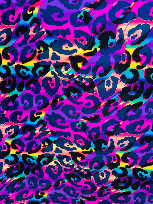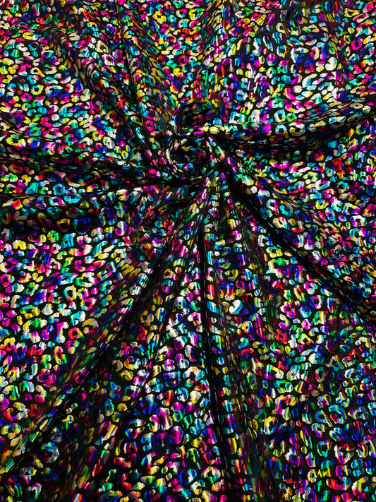 Wild Leopard design Multicolor hologram metallic nylon spandex 4-way stretch 58/60” Sold by the YD