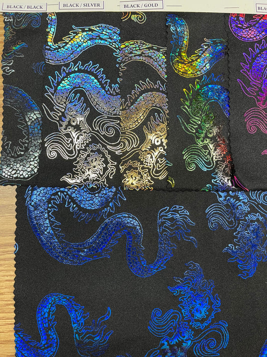 Exotic Dancing Dragón design hologram nylon spandex 4-way stretch 58/60” Sold by the YD. Ships Worldwide from Los Angeles California USA.