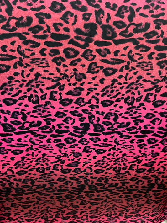 Exotic Leopard design print on ombre hot pink spandex 4-way stretch 58/60” Sold by the YD. Ships Worldwide from Los Angeles California USA.