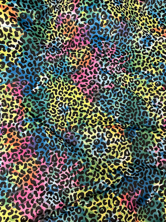 Exotic leopard design print on tie dye nylon spandex 4-way stretch 58/60” Sold by the YD. Ships Worldwide from Los Angeles California USA.