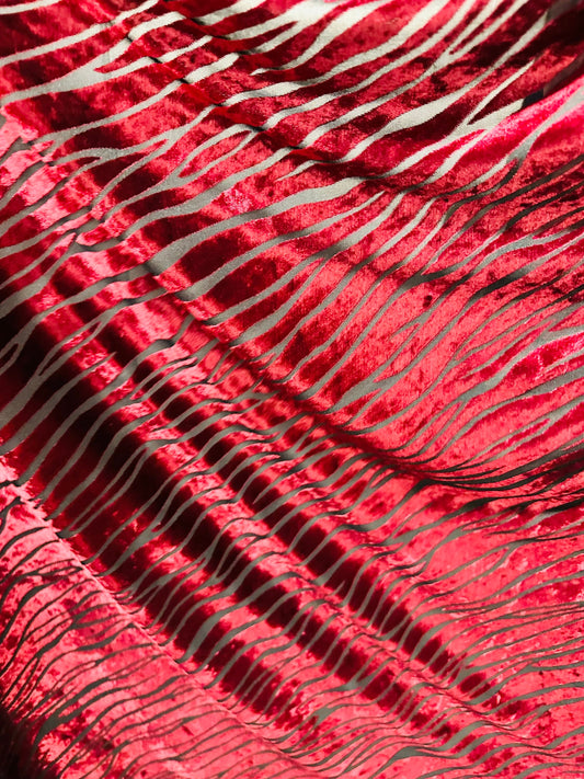 Exotic zebra design Merlot color luxury burnout stretch velvet 2-way stretch 58/60” Sold by the YD.