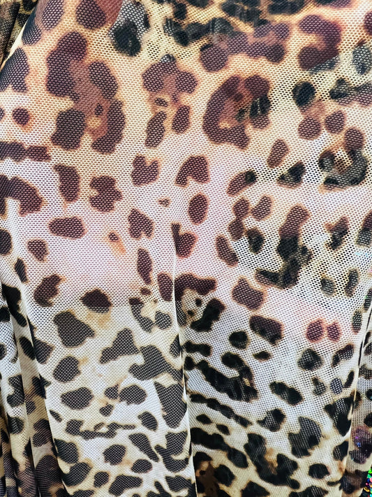 Leopard design print on great quality of power mesh 4-way stretch 58/60” Sold by the YD. Ships worldwide from Los Angeles California USA.