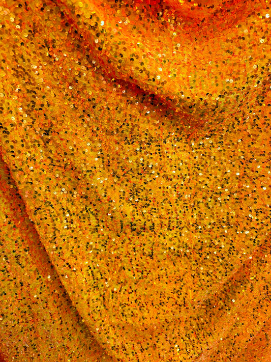 Luxury Iridescent sequins neon orange embroidered on stretch velvet 4-way stretch 58/60” Sold by the YD.