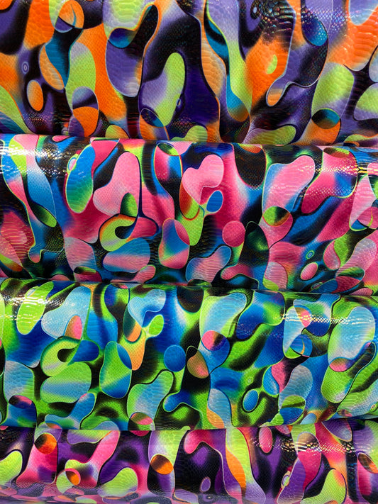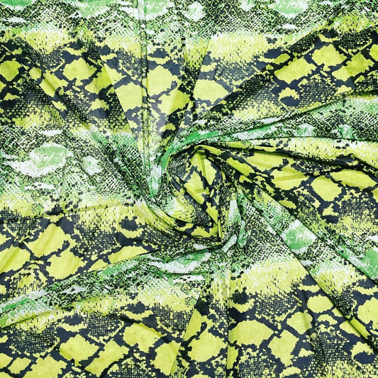 Anaconda snake design print on nylon spandex with iridescent clear foil UV light neon colors it glows in the dark 4-way stretch 58/60” Wide