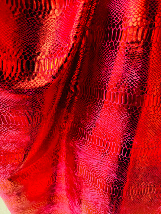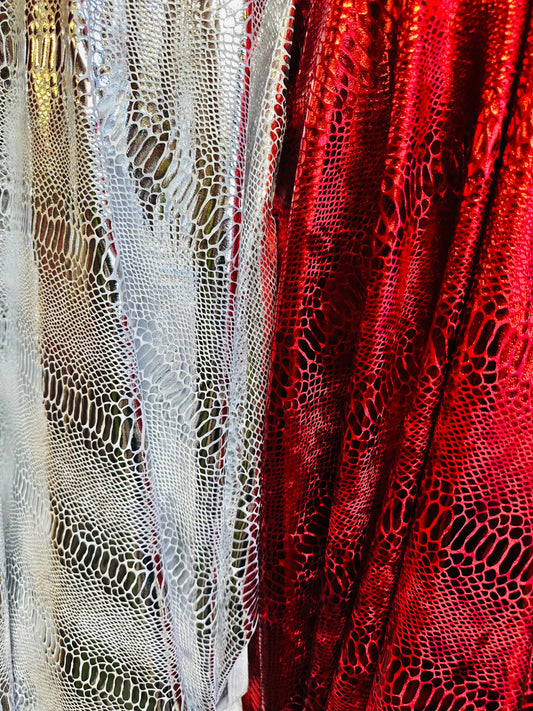 Anaconda design exotic snake skin holothin foil best quality of metallic nylon spandex 4-way stretch 58/60” Sold by the YD. Ships Worldwide