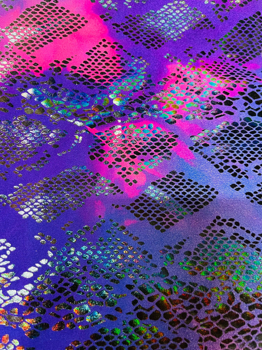Anaconda exotic snake skin tie dye hologram metallic nylon spandex 4-way stretch 58/60” High quality fabrics by AlexLAFabrics