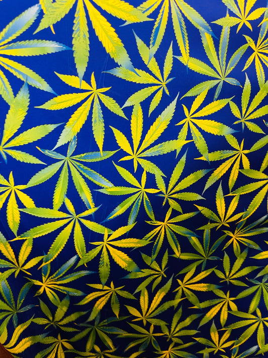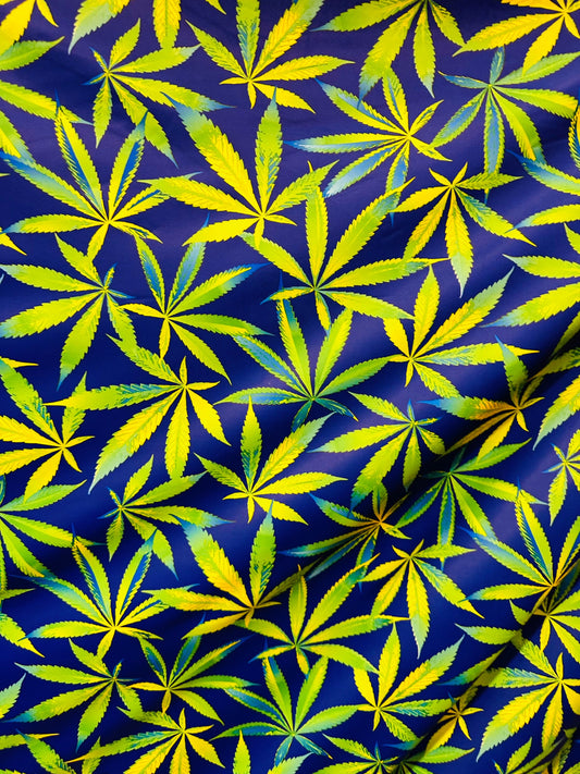 Marihuana Cannabis leaf design multicolor print on great quality of nylon spandex 4-way stretch 58-60”