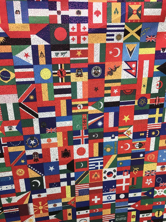Multi flag design on nylon spandex 4way stretch with foggy foil all over 58/60" Sold by the Yd. Ships worldwide from Los Angeles California.