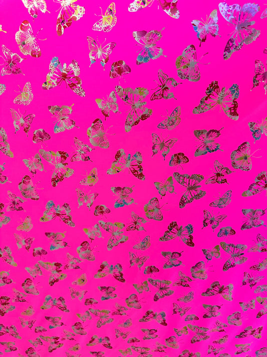 Butterfly design on best quality of nylon spandex 4-way stretch Neon Pink with rainbow foil 58/60” Sold by the YD.