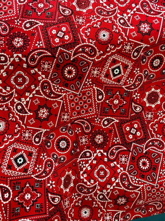 100% cotton red bandana paisley design print on great quality of cotton soft fabric 54/55” Sold by the YD. Ships worldwide from Los AngelesRegular price $14.99 USDRegular priceUnit price / per-