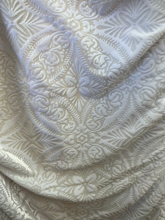 New burnout velvet white color Victoria design 4-way stretch 58/60” Sold by the YD. Ships Worldwide from Los Ángeles California USA.