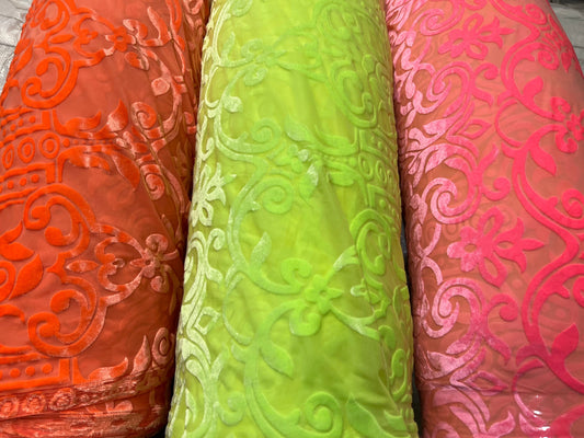 New Victoria Luxury design neon colors burnout stretch velvet 4-way stretch 58/60” Sold by the YD. Ships worldwide from Los Angeles CA