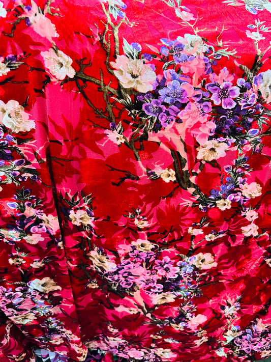 New Luxury burnout velvet Red/Multicolor Blend silk 4-way stretch 50/52” Sold by the YD. Ships Worldwide from Los Angeles California USA.