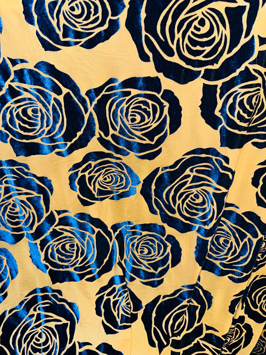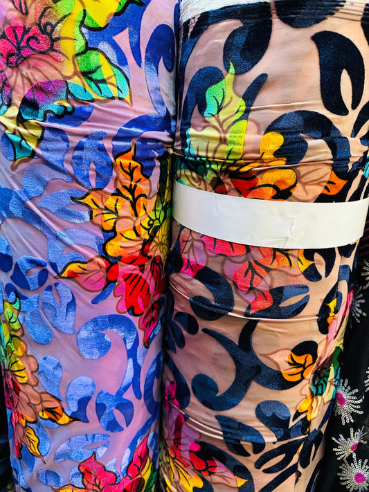 New Luxury burnout velvet flower design sapphire/multi 4-way stretch 54/55” Sold by the YD. Ships Worldwide from Los Angeles California USA.