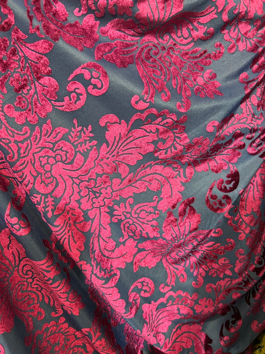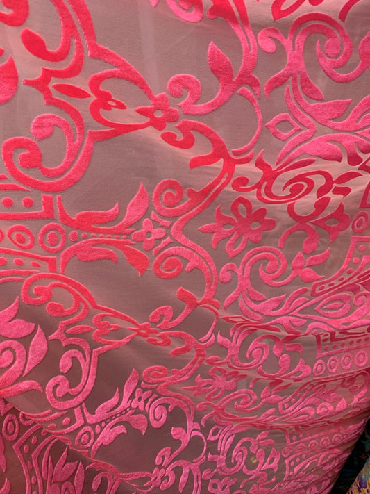 New burnout velvet victoria design hot pink 4way stretch 58/60" Sold by the YD. Ships worldwide from Los Angeles California USA.
