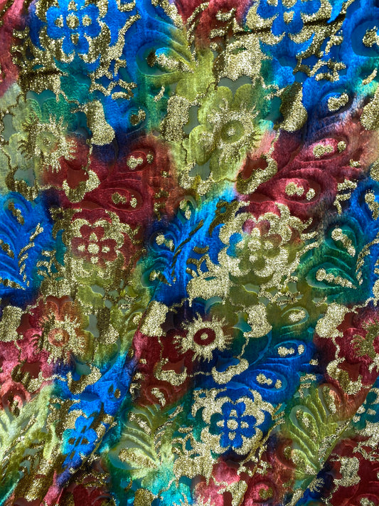 New luxury Silk burnout velvet tie dye with metallic lurex 50/52” Sold by the YD. Ships worldwide from Los Angeles California USA.