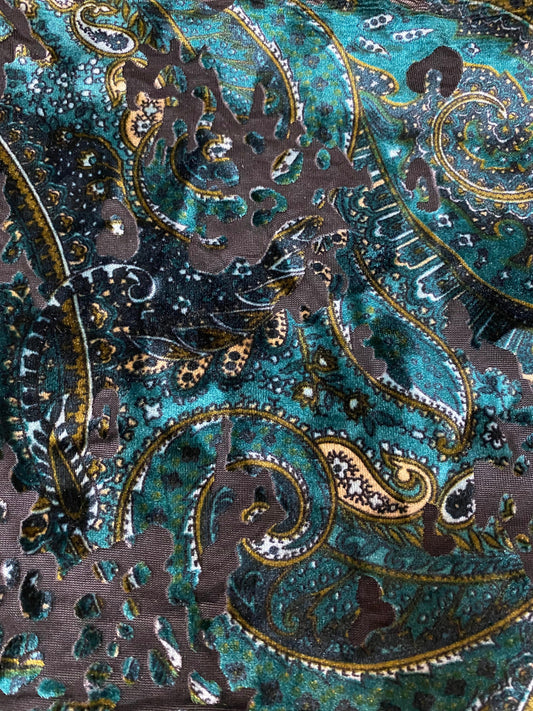 New Luxury paisley design print on burnout velvet peacock green 4-way stretch 58/60” Sold by the YD. Ships Worldwide from Los Angeles CA USA