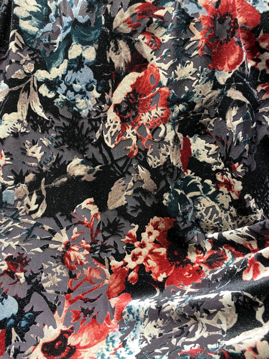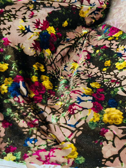 New Burnout velvet flower design Black multicolor 4-way stretch 58/60” Sold by the YD. Ships Worldwide from Los Angeles California USA.