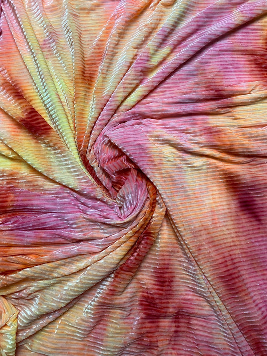 New Stripes burnout velvet tie dye Orange/yellow/pink 4-way stretch 58/60” Sold by the YD. Ships Worldwide from Los Angeles California USA.