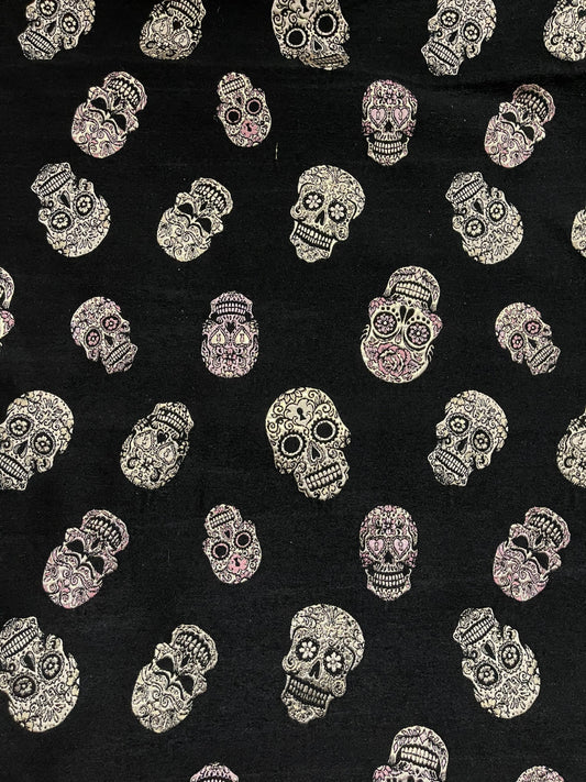 Skull design embroidered on metallic Chenille non stretch black/gold 58/60” Sold by the YD. Ships Worldwide from Los Angeles CA USA.