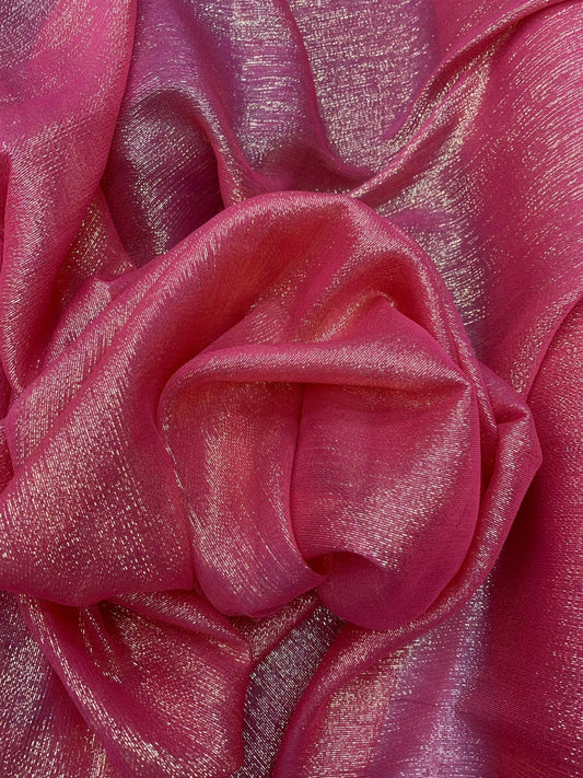 Silk metallic chiffon hot pink/silver gold 2way Stretch 44/45" Sold by the YD. Ships worldwide from Los Ángeles California USA.