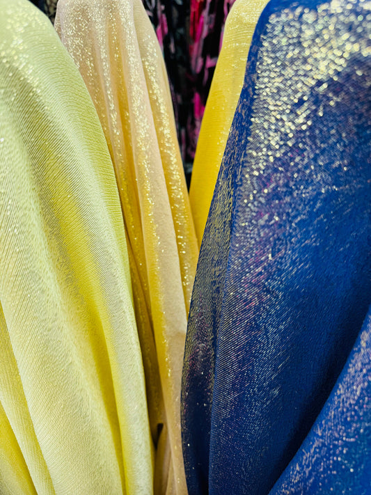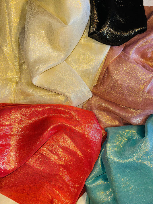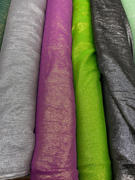 Silk metallic chiffon various colores in stock 2way Stretch 44/45” Sold by the YD. Ships worldwide from Los Ángeles California USA.