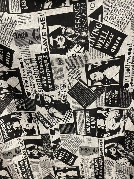 New newspaper fashion design print on cotton Jersey 4-way stretch 58/60” Sold by the YD. Ships Worldwide from Los Angeles California USA