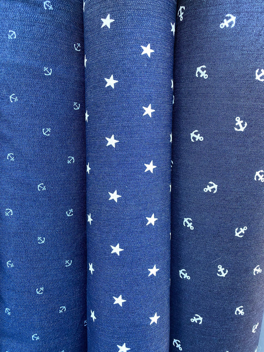 New stretch denim anchor design and stars design 2-way stretch 54/55” Sold by the YD. Ships worldwide from Los Angeles California USA.