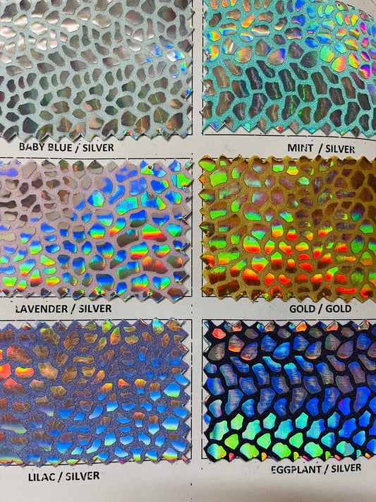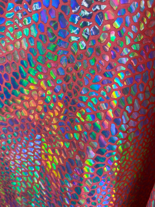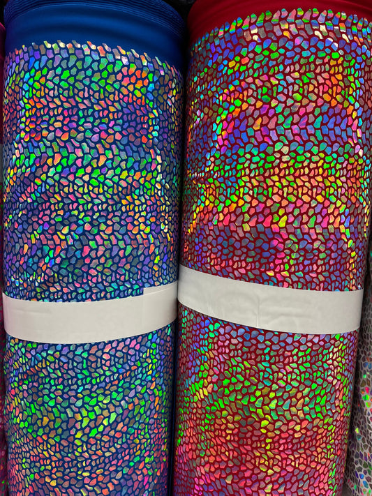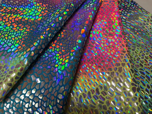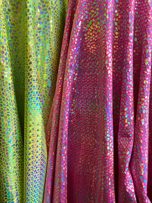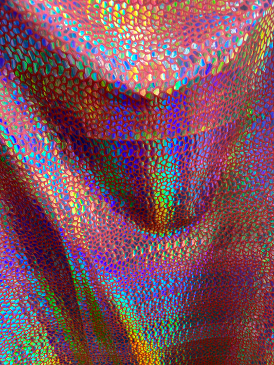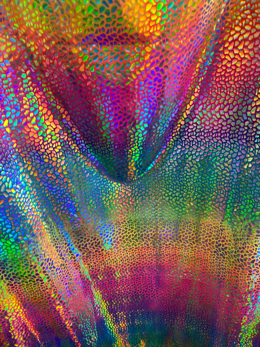 New dragon scales iridescent foil on nylon spandex 4-way stretch hologram metallic fabric 58/60” Sold by the YD. Ships worldwide from L.A CA
