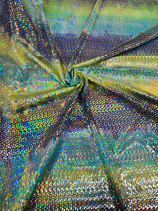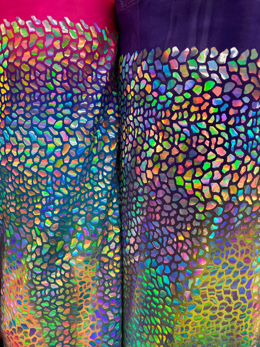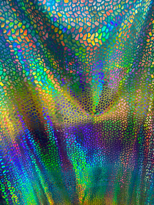 New dragon scales iridescent foil on nylon spandex 4-way stretch hologram metallic fabric 58/60” Sold by the YD. Ships worldwide from Los An