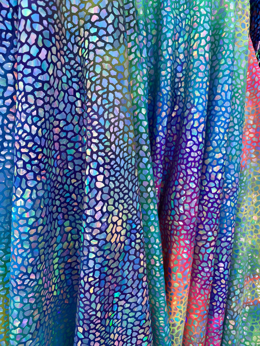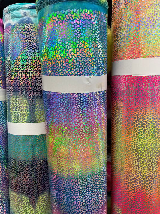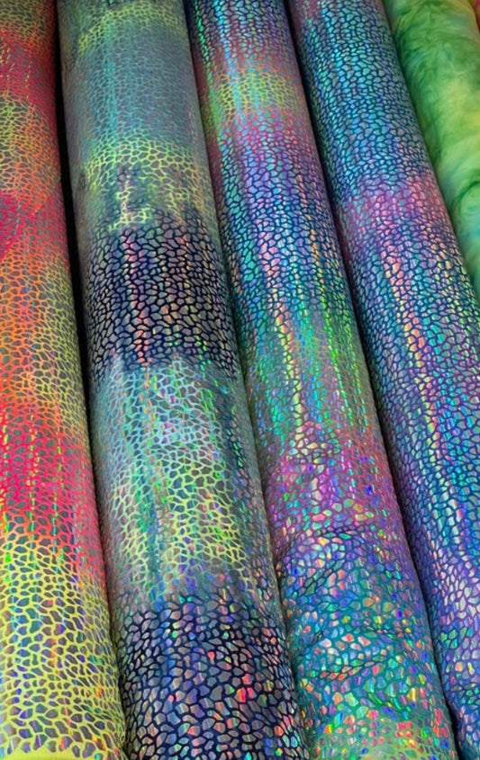 New Dragon scales Iridescent foil on Great tie dye nylon spandex 4-way stretch 58/60” Sold by the YD. New fabric in stock.