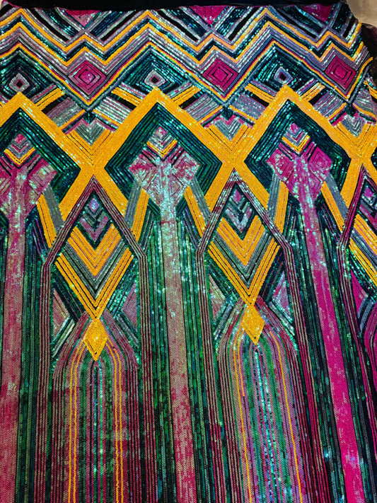 New Geometric design multicolor sequins on stretch mesh 2-way 55/57” Sold by the YD. Ships worldwide from Los Angeles California USA.