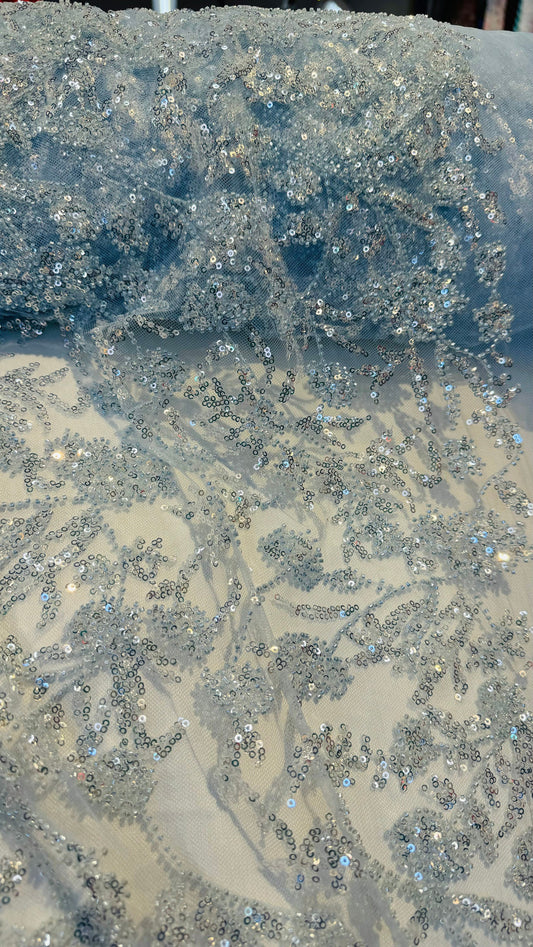 New Luxury Jlo sequins design Tiffany blue embroidered on stretch power mesh 4-way stretch 55/57” Sold by the YD. Ships worldwide from L.A