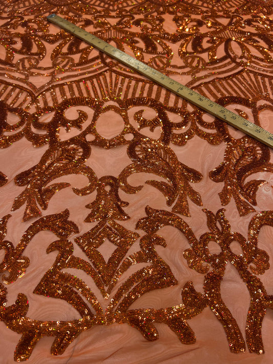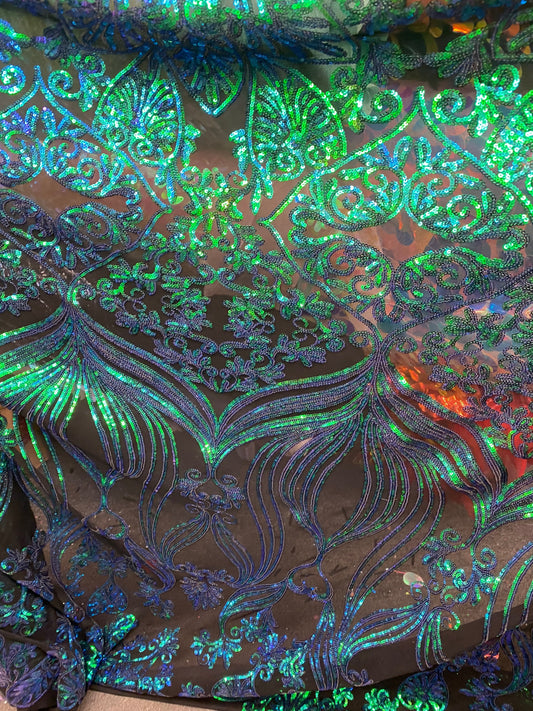New Luxury iridescent sequins Diana design embroidered on 4-way stretch mesh 55/57” Sold by the YD. Ships Worldwide from Los Ángeles Calif