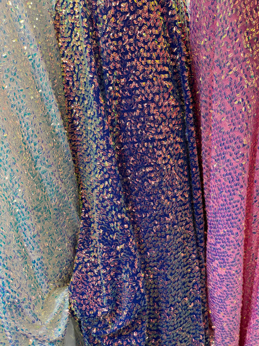 New Luxury sequins Jennifer design embroidered iridescent sequins on stretch mesh 2-way 55/55” Sold by the YD. Ships worldwide