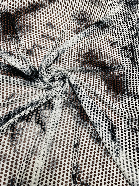 New Tye Dye fishnet white/black nylon spandex 4-way stretch 58/60” Sold by the YD.