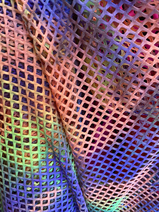 Fishnet Tie Dye design Diamond nylon mesh ;-way stretch 58/60” Sold by the YD. Ships worldwide from Los Angeles California USA.