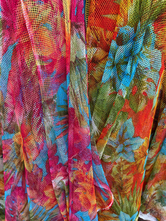 New Fishnet floral design Poly mesh 2-way stretch 58/60” Sold by the YD. Ships Worldwide from Los Angeles California USA.