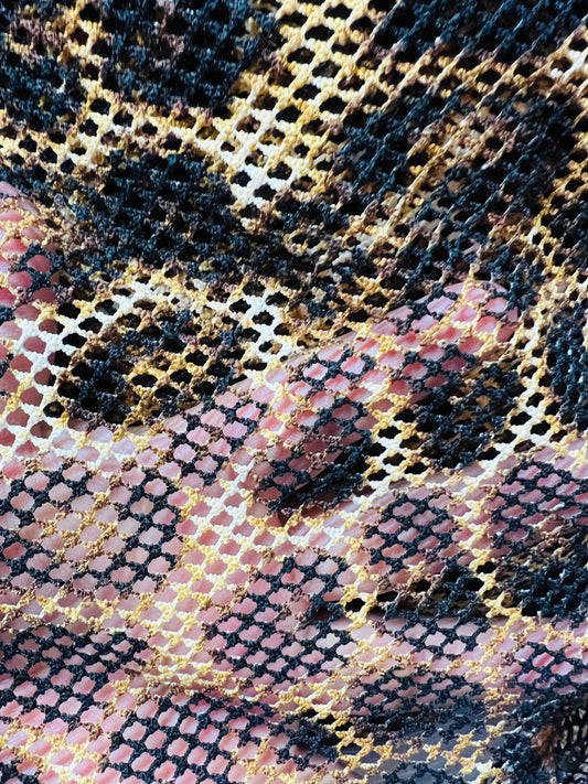 Exotic Leopard design print on poly fishnet 2-way stretch 58/60” Sold by the YD. Ships Worldwide from Los Angeles California USA