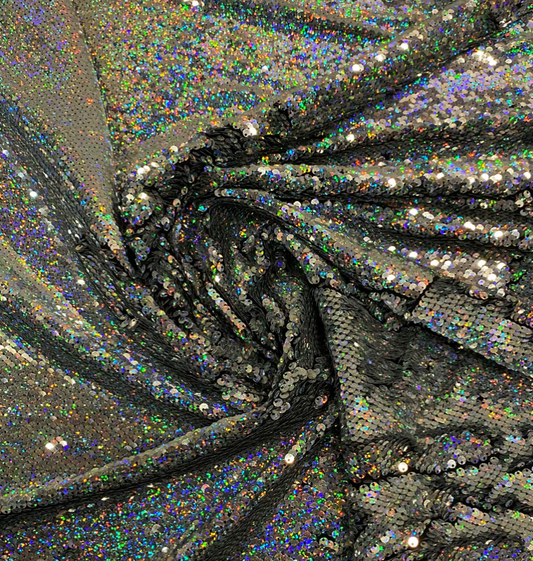 New hologram silver/silver reversible flip up sequins on spandex base 2-way stretch 58/60”