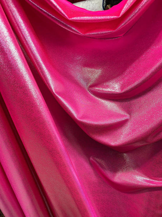 New foggy foil metallic nylon spandex neon pink/silver 4-way stretch 58/60” Sold by the YD. Ships worldwide from Los Angeles California USA.