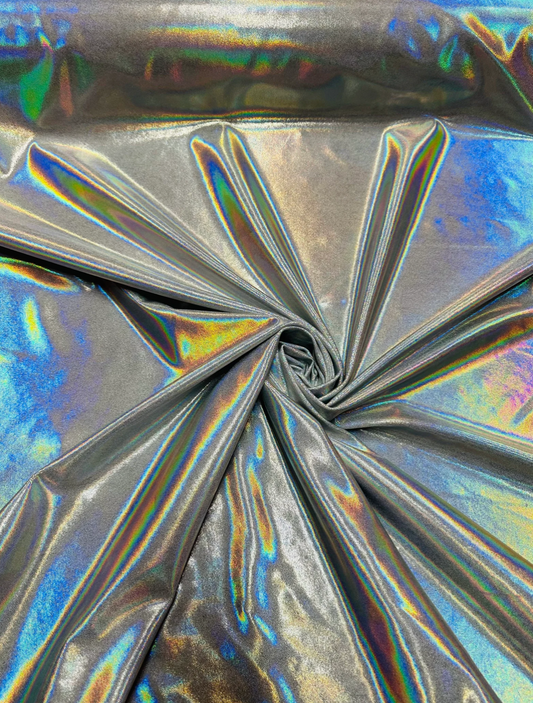 Oil slick design iridescent white silver foggy foil hologram metallic nylon spandex 4-way stretch 58/60”