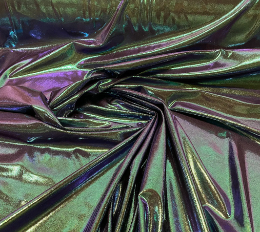 New oil slick iridescent blue green hologram metallic nylon spandex 4-way stretch 58/60”