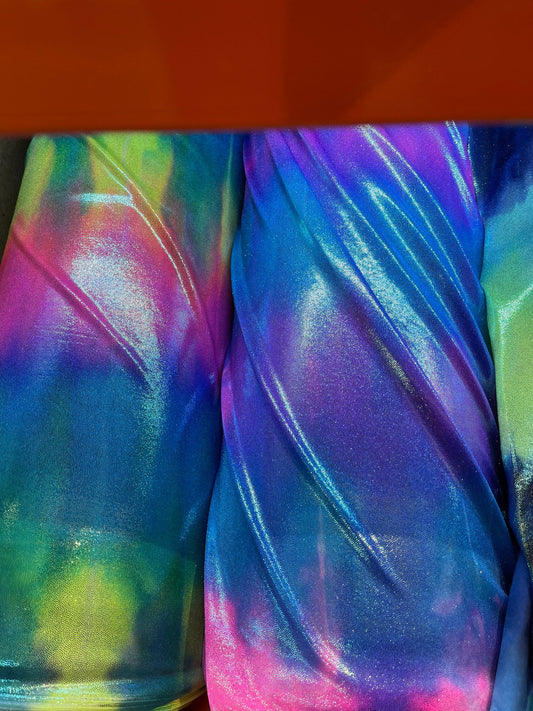 Now Tie dye foggy foil metallic nylon spandex 4-way stretch 58/60” Sold by the YD. Ships Worldwide from Los Angeles California