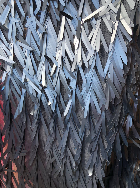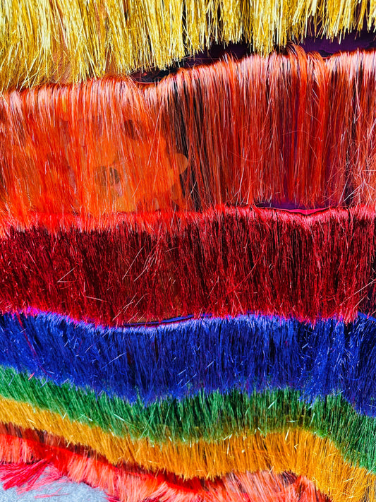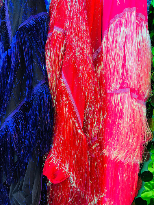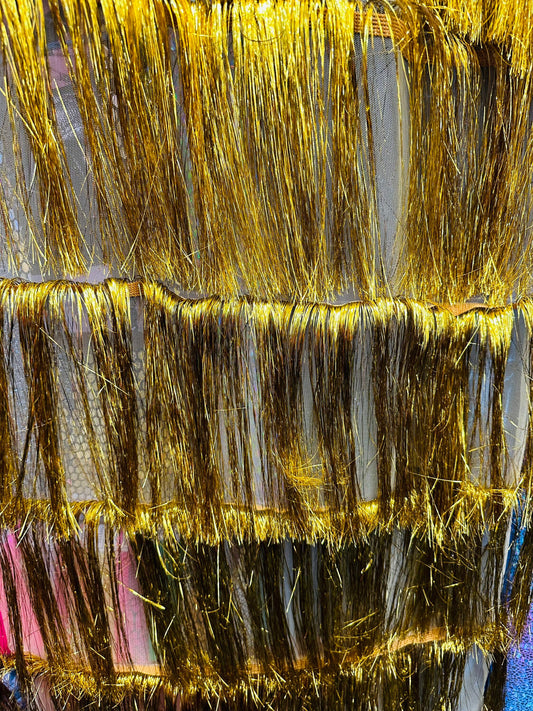 Luxury Tinsel foil Fringe embroidered on stretch mesh 4-way stretch 58/60” Sold by the YD.