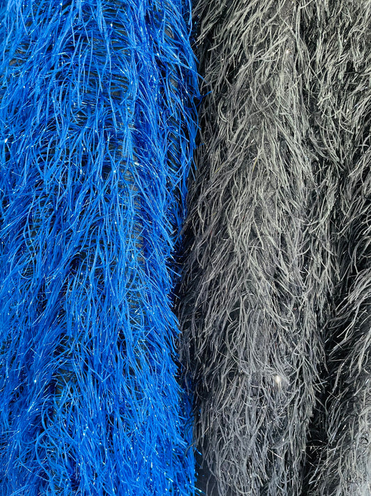 Fancy multi luxury tinsel fringe design metallic long hair embroidered on stretch mesh 2-way stretch 58/60” Sold by the YD. Ships Worldwide
