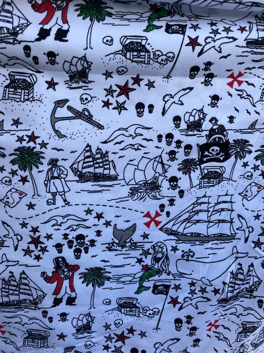 New Pirate design print on poly spandex 4-way stretch 58/60” Sold by the YD. Ships Worldwide from Los Angeles California USA.