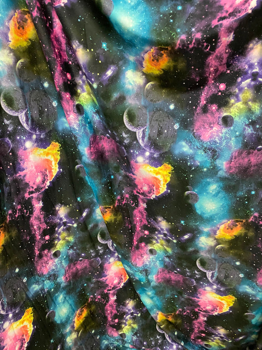 New Galaxy design multicolor print on poly spandex light weight 4-way stretch 58/60” Sold by the YD. Ships worldwide from Los Angeles CA USA