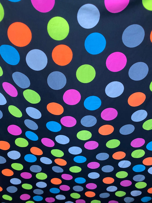 New multicolor polka dots design print on poly spandex 4-way stretch medium weight 58/60” Sold by the YD. Ships worldwide from Los Angeles